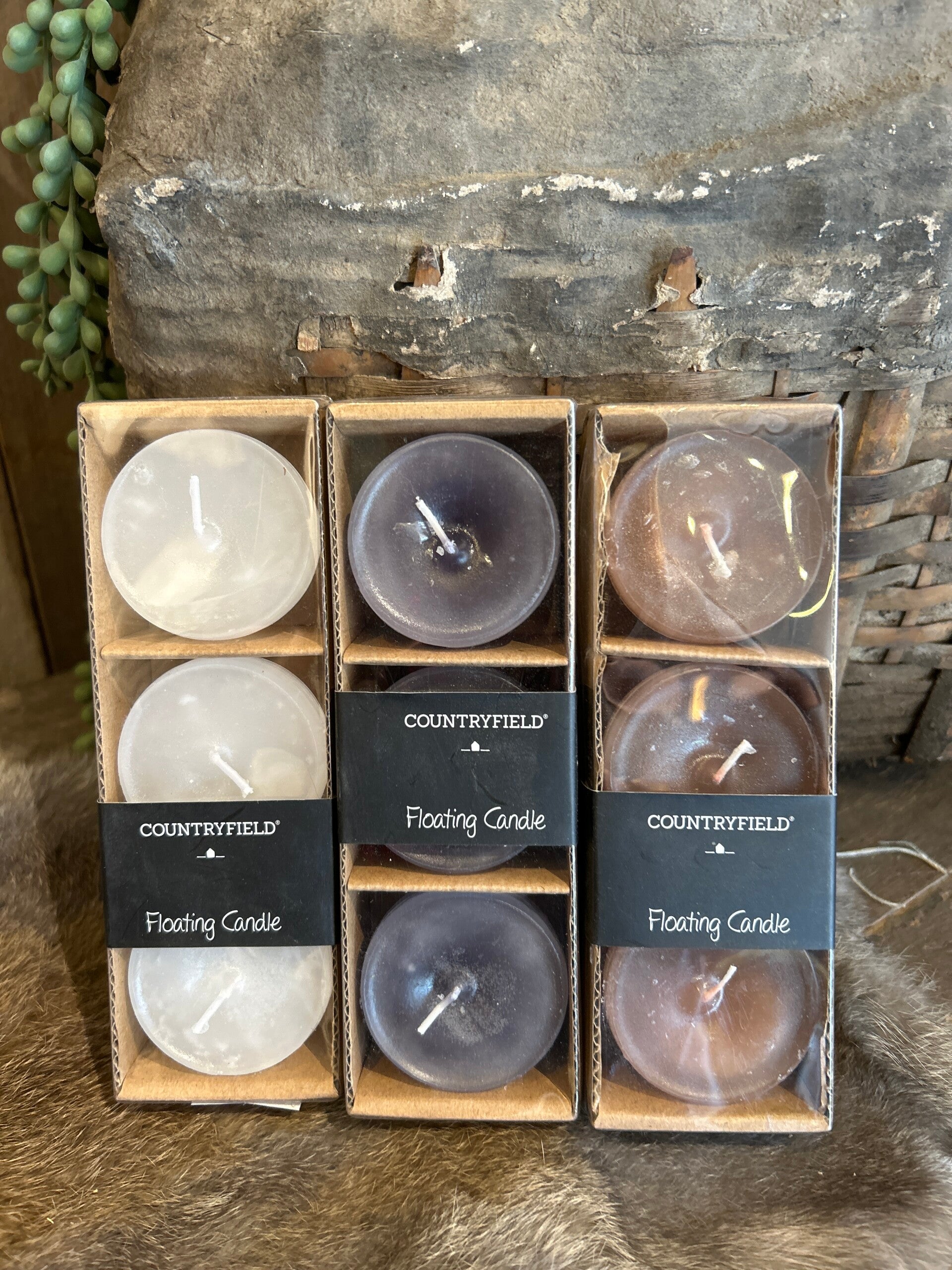 Setje Countryfield drijfkaarsen in zachte tinten – perfect voor een sfeervol moment in een schaal met water.