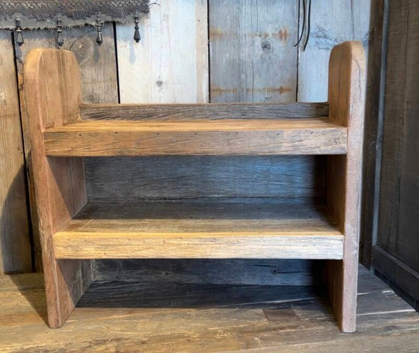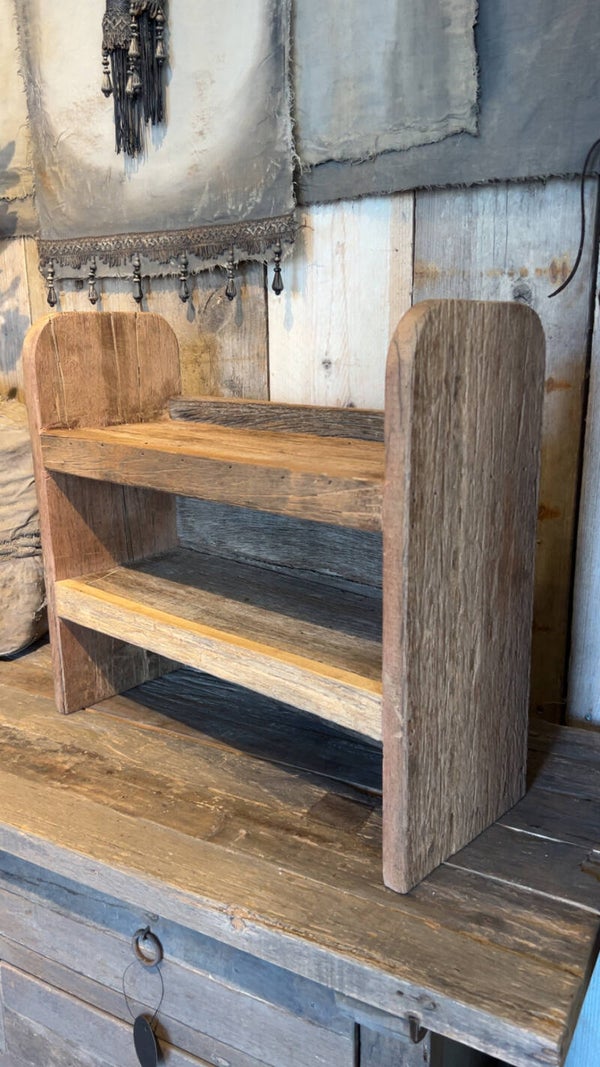 Dit robuuste rek van gerecycled truckbodywood is perfect voor je kruiden, potjes, woondecoratie of… gewoon om mee te pronken.