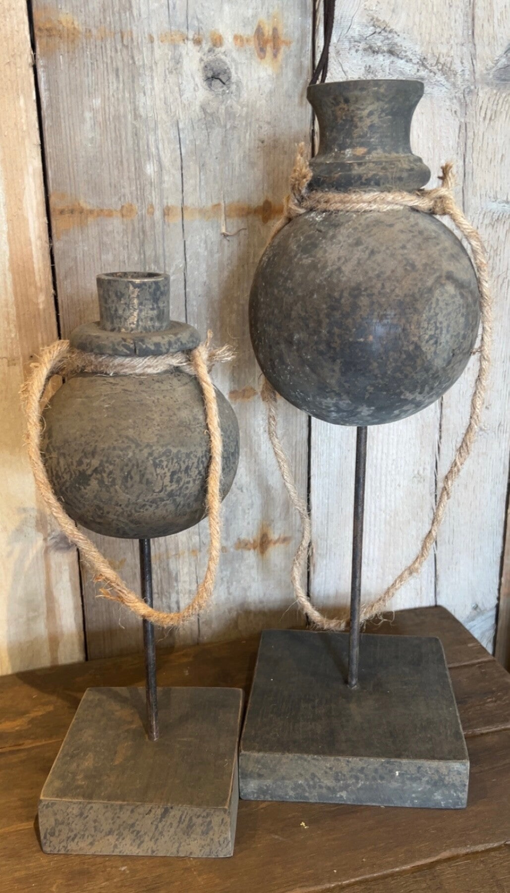 Gemaakt van verweerd hout in de vorm van een oude waterkruik (jug), op een robuuste voet.