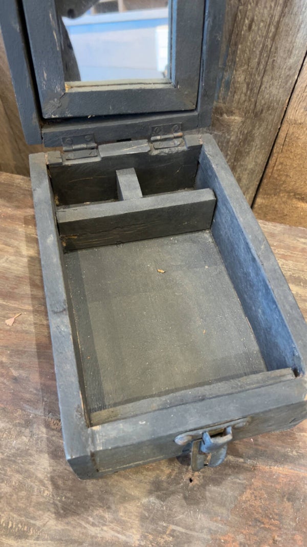 Stoer, sober en authentiek houten doosje met spiegel in het deksel.