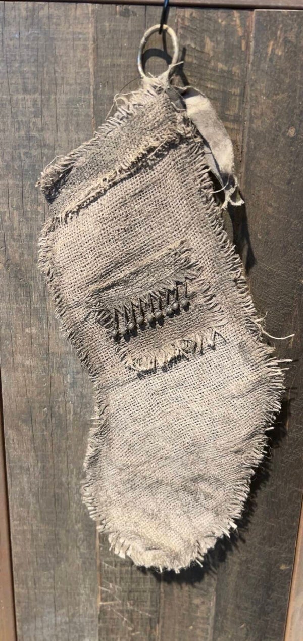 Prachtige stoere, handgemaakte kerstsok van grof linnen met rafelranden — perfect voor de landelijke stijl! 🎄