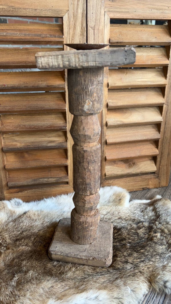 Stoere houten kandelaar met een prachtig doorleefd uiterlijk.