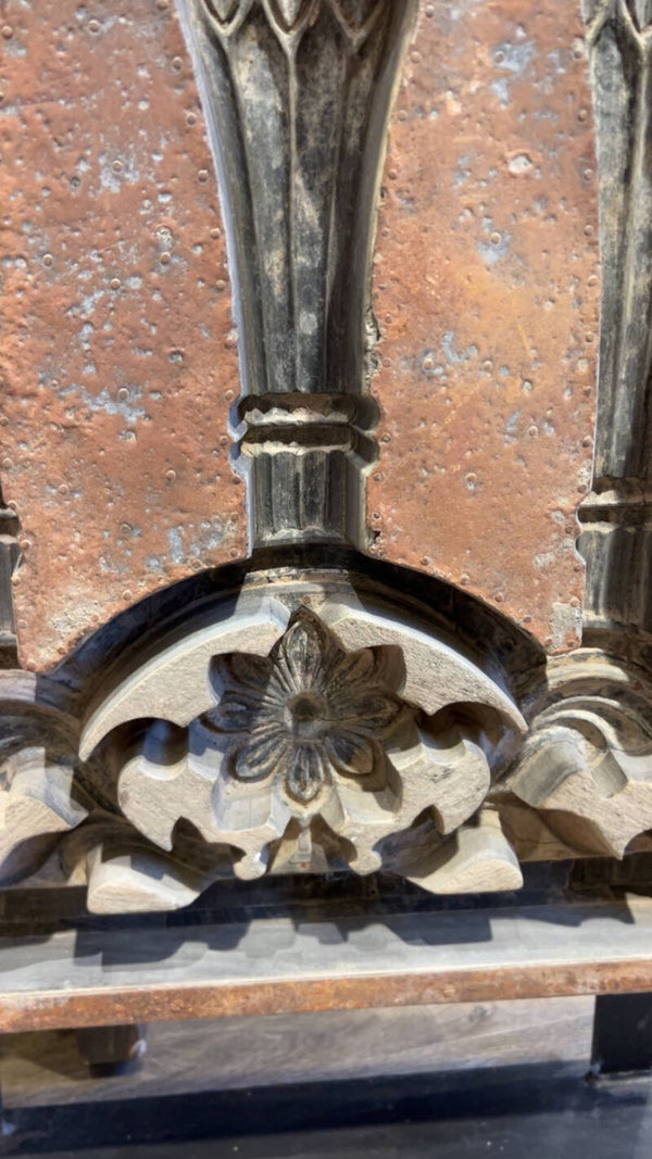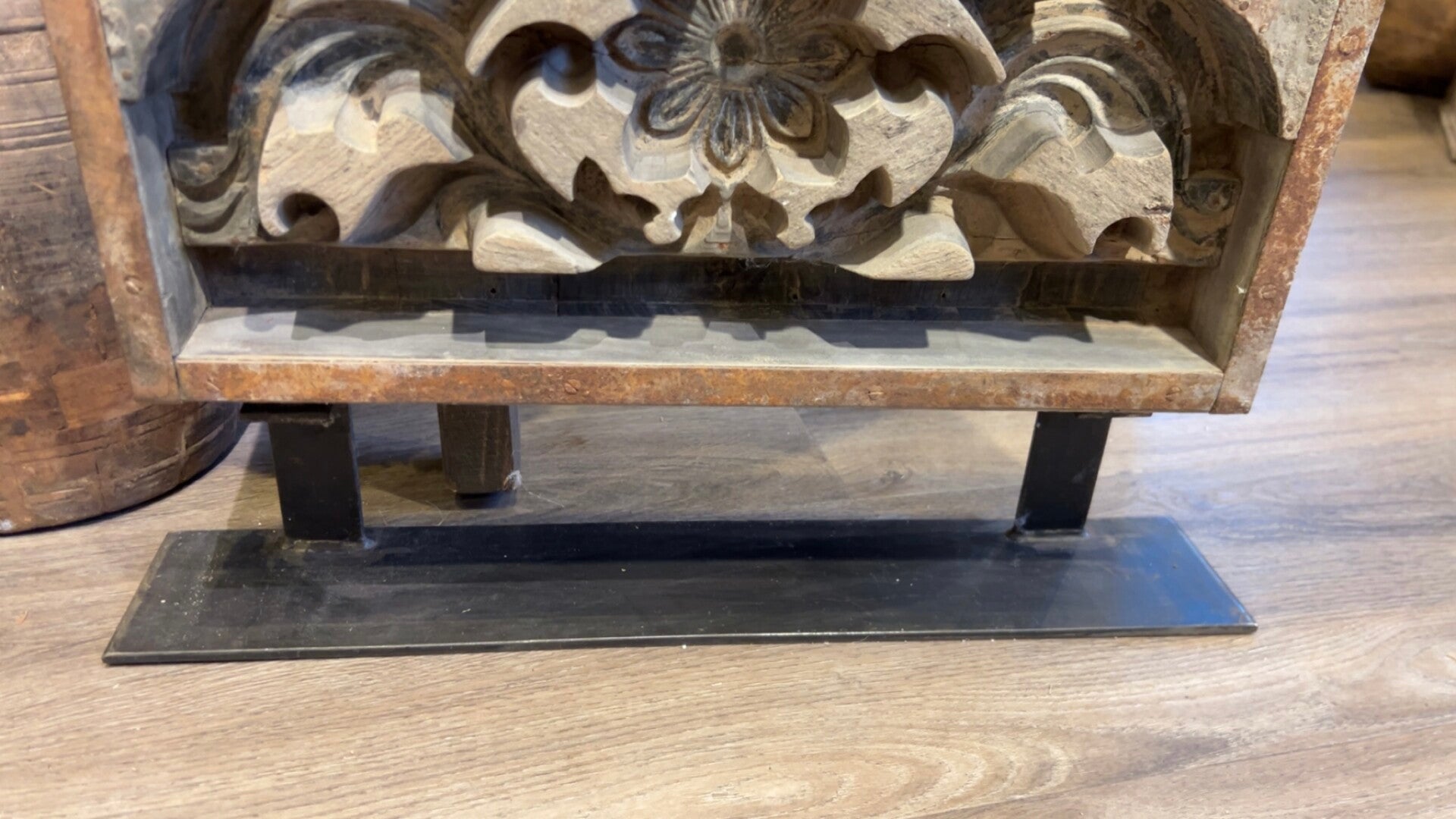 Dit stoere ornament is gemaakt van oud houtsnijwerk met prachtige klassieke details en een verweerde landelijke look. Het houtsnijwerk is omlijst met een robuust houten frame en staat stevig op een industriële metalen voet.