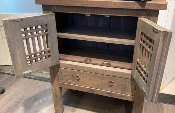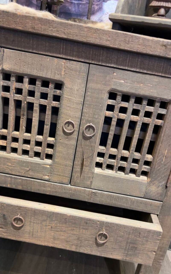Dit prachtige driftwood kastje is een echte sfeermaker in een landelijk, sober of industrieel interieur. De vergrijsde houten uitstraling, de unieke roosterdeurtjes en de stoere laden maken dit kastje niet alleen mooi, maar ook functioneel.