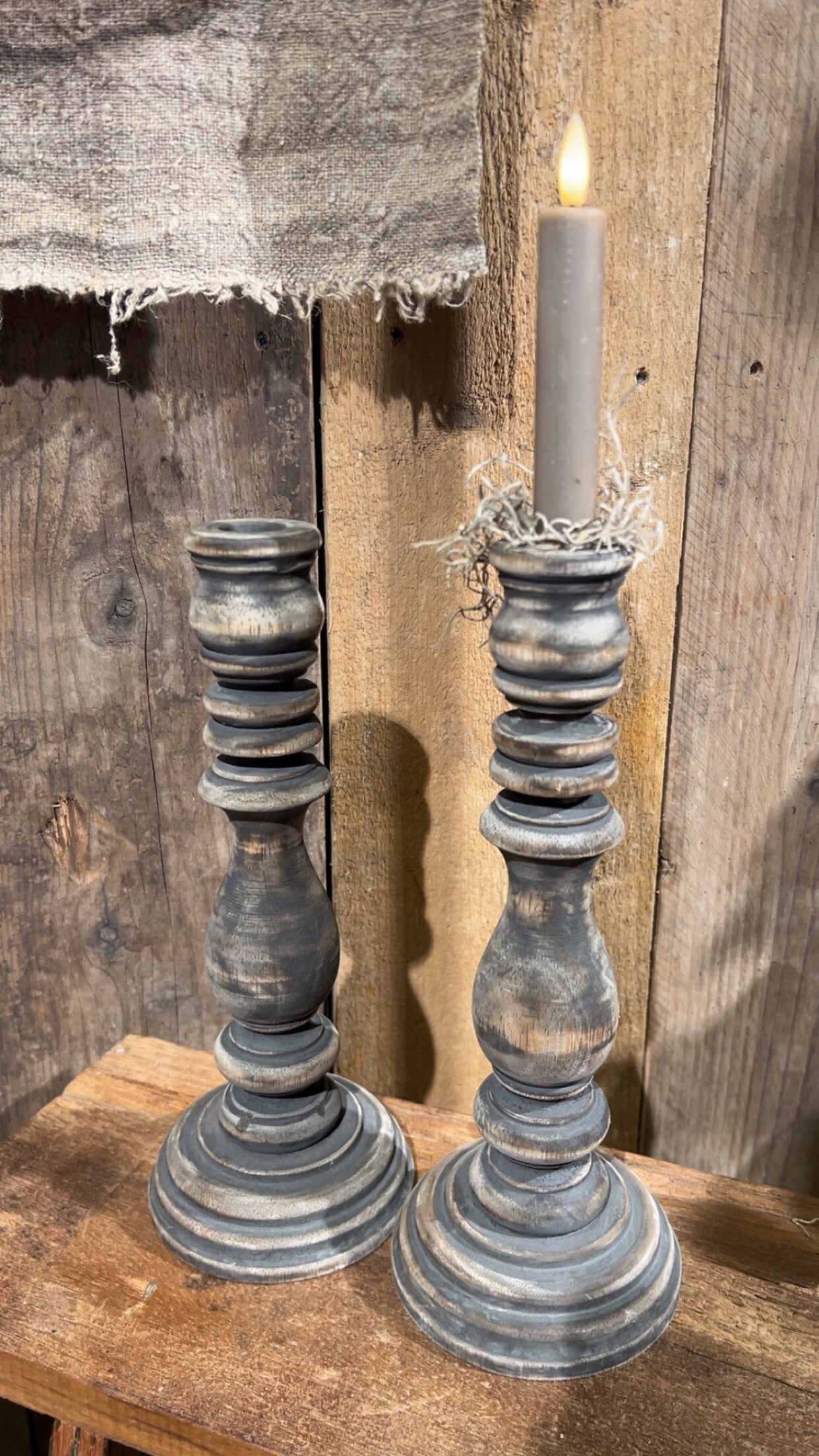 Deze prachtig vergrijsde houten kandelaar brengt direct sfeer in elk interieur. De robuuste, gedraaide vorm en het doorleefde karakter geven een stoere, landelijke look.