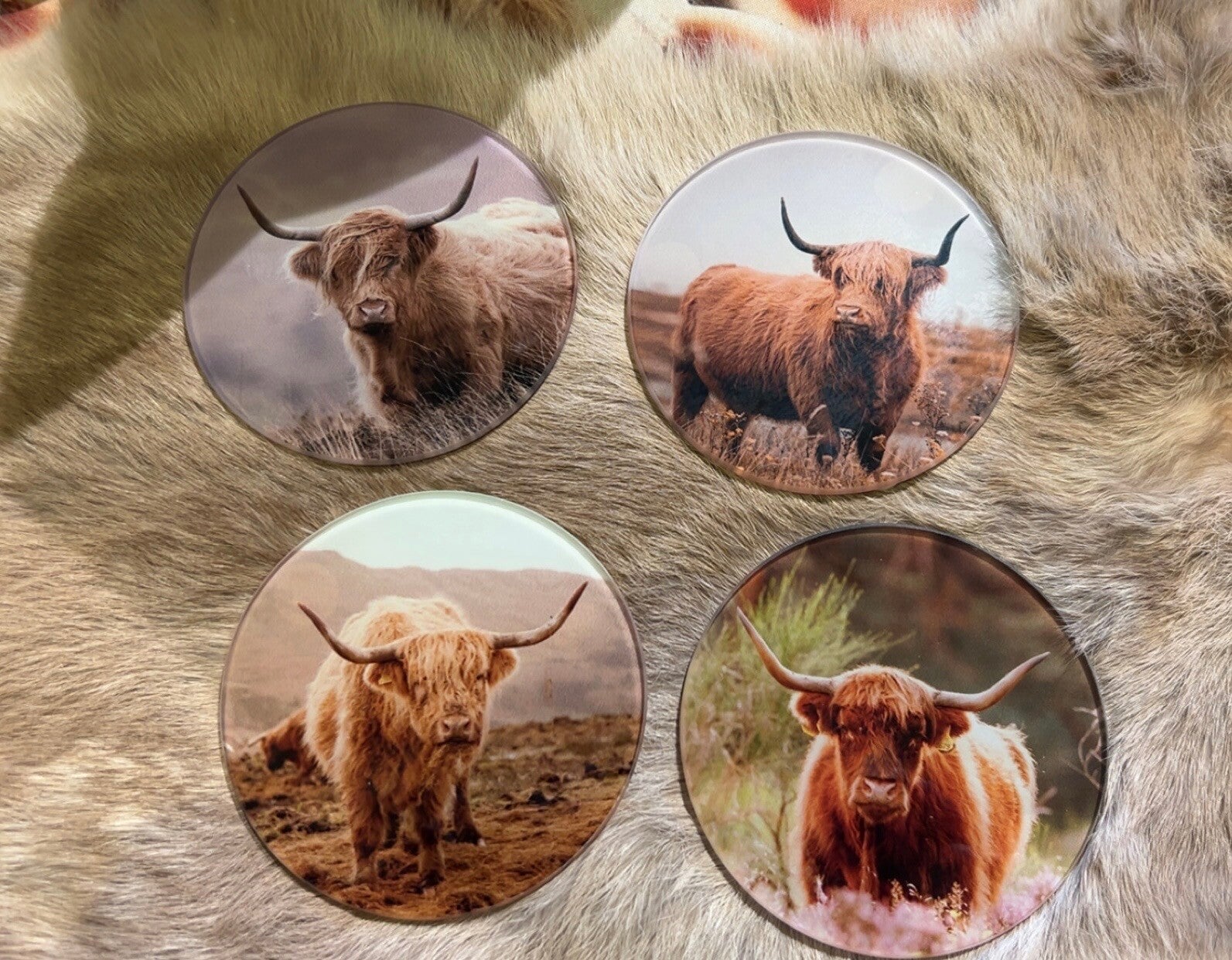 Stijlvolle ronde glazen onderzetters met fotoprint van Schotse hooglanders. Beschermen je tafel tegen kringen en hitte en passen perfect in een landelijk of Scandinavisch interieur. Ook leuk als cadeau.