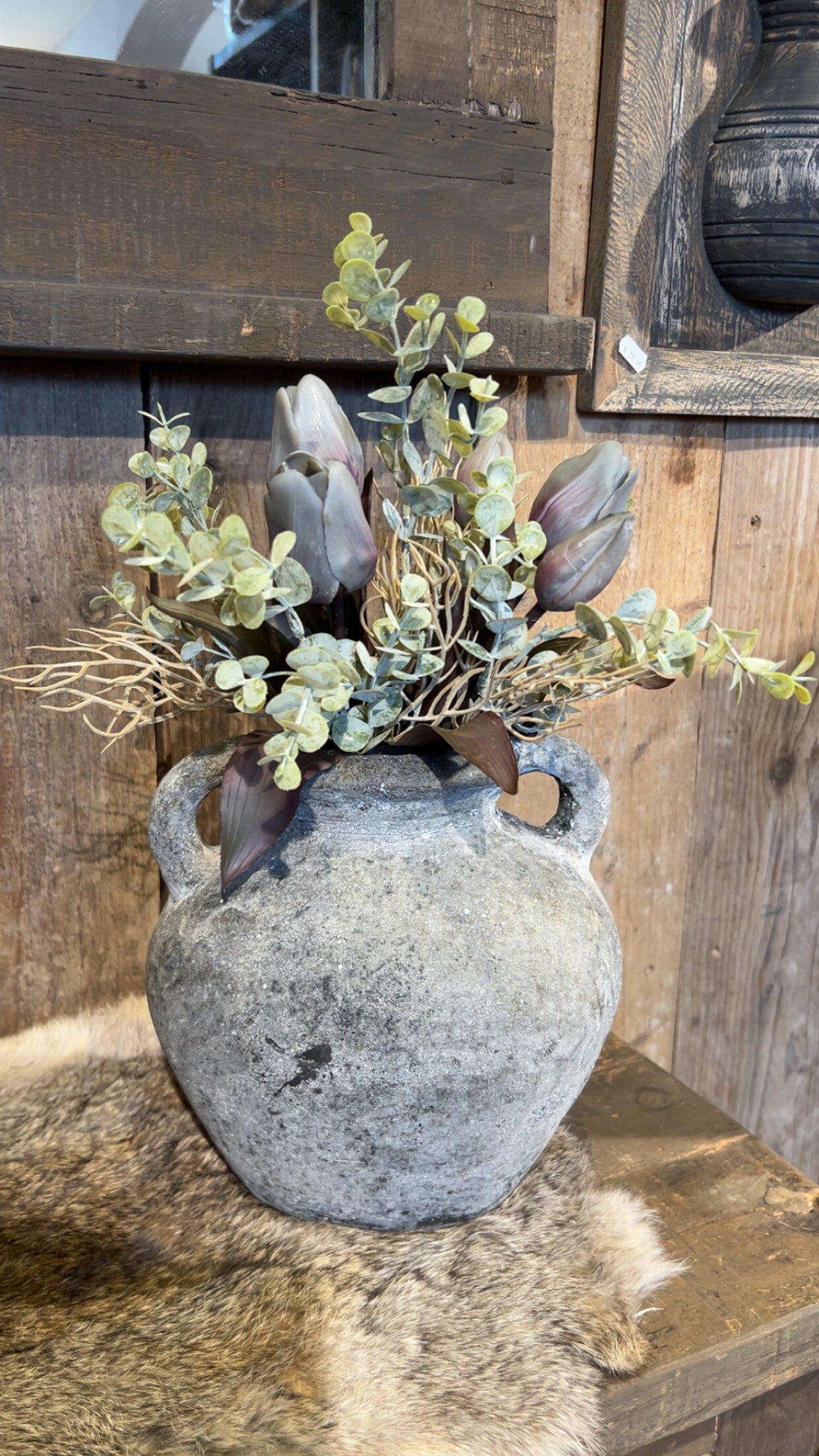 Deze robuuste kruik met twee oren is gecombineerd met een sfeervol kunstboeket met tulpen en eucalyptus. De zachte, natuurlijke tinten zorgen voor een warme en landelijke uitstraling. Een mooi decoratief item dat perfect past in een sober & stoer interieur.