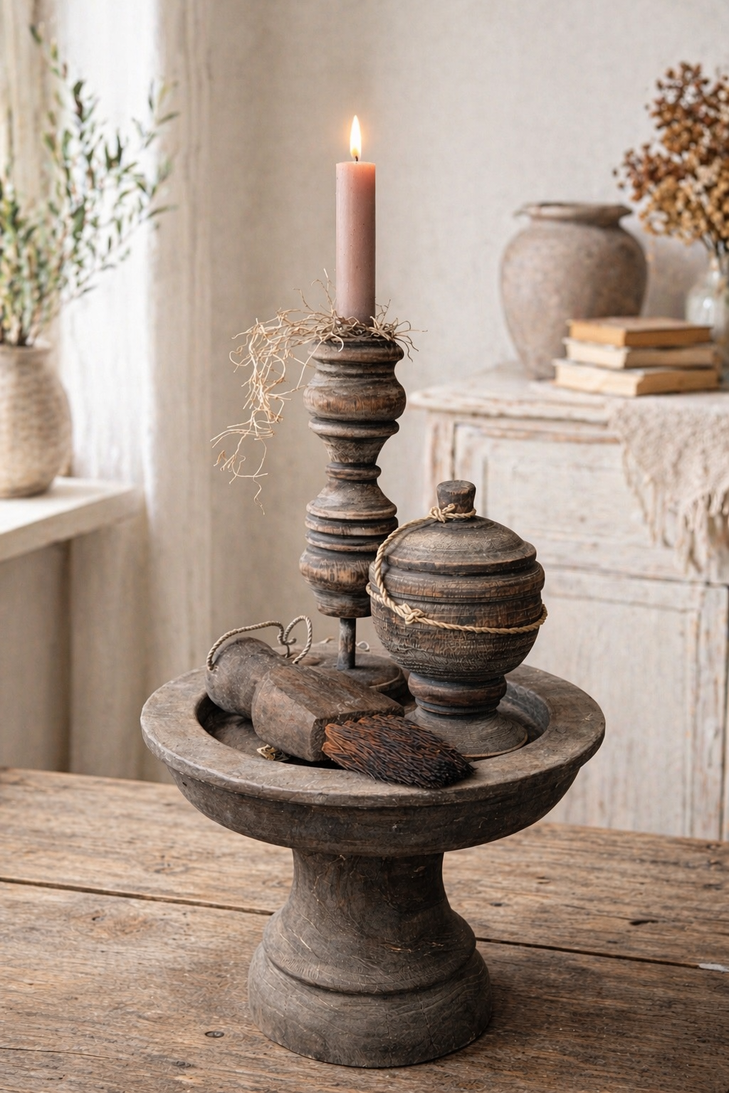 Sfeervolle landelijke set op etagère