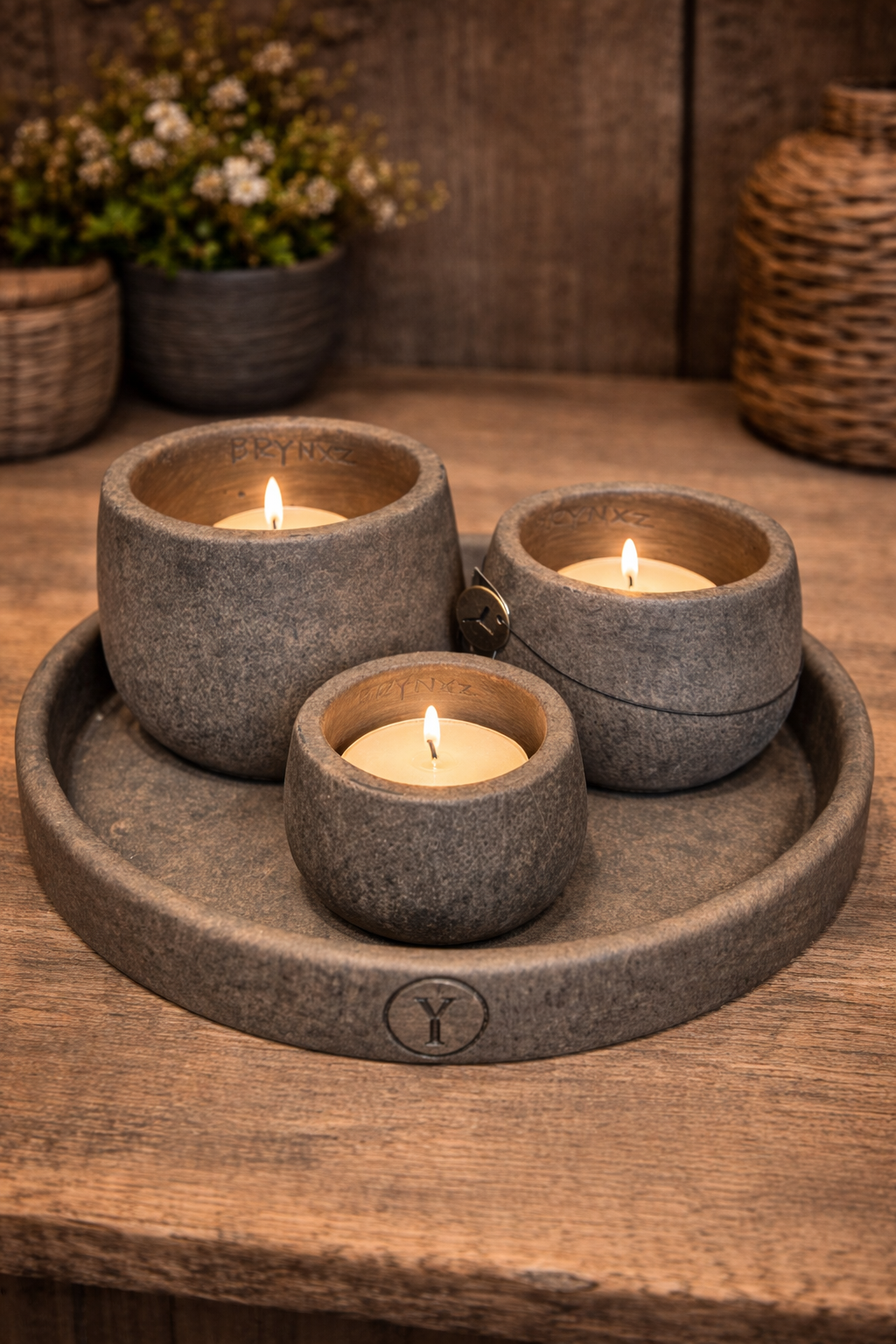 Een sfeervolle, compacte set in de bekende sobere en stoere Brynxz stijl. De schaal heeft een doorsnede van 30 cm en wordt geleverd met 3 bijpassende waxinelichtjes in verschillende formaten.